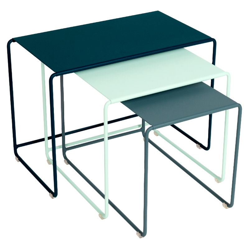 Das OULALA Couchtisch-Trio von Fermob kombiniert drei geometrische Formen, drei Höhen und drei Farben zu einem flexiblen Designensemble. Die Tische lassen sich ineinander schieben oder frei arrangieren – perfekt für Garten, Terrasse oder Wohnzimmer.