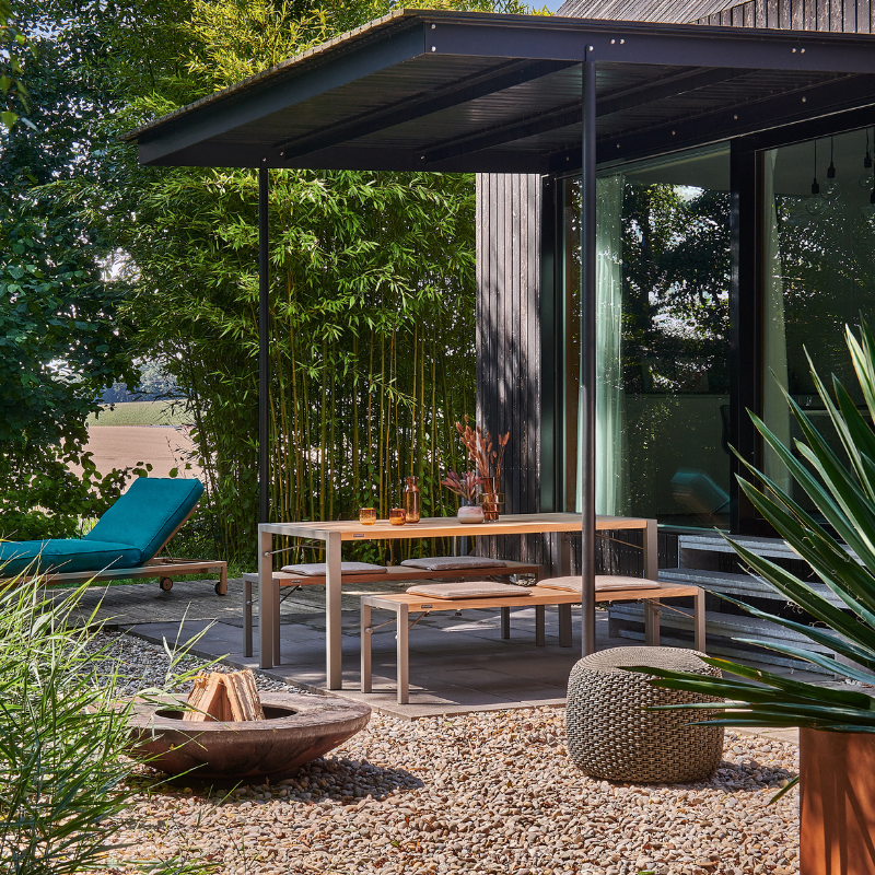 Die Flip Bank von Weishäupl ist die perfekte Ergänzung zum Flip Tisch – funktional, formschön und platzsparend. Mit einem einfachen Mechanismus lässt sie sich schnell zusammenklappen und verstauen. Das massive Teakholz und das Edelstahlgestell (wahlweise pulverbeschichtet) sorgen für Stabilität und eine hochwertige Optik – ausgezeichnet mit dem Red Dot und Product Design Award 2010.